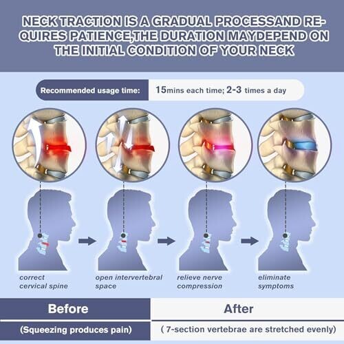 The device combines tightening, pushing up, and fixing in three steps, aiming to stabilize and restore the cervical spine. Initial use may cause discomfort, which should improve with neck exercises 2-3 times daily for 10-20 minutes each session, alleviating symptoms like stiff shoulders and neck and occasional dizziness.
