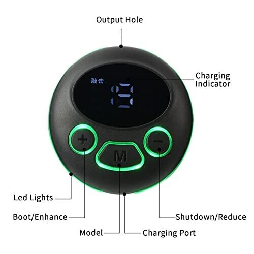 The device is a cordless EMS massager designed for acupoint stimulation and can be used on arms, neck, shoulders, back, waist, and legs. It supports USB charging; after a 2-hour charge, a session lasts about 15 minutes, with an estimated continuous use period of 10 days. The massage pad dimensions are 7.4 cm in diameter and 1.7 cm in thickness. The unit offers six different massage techniques.