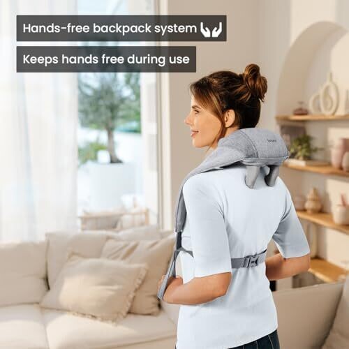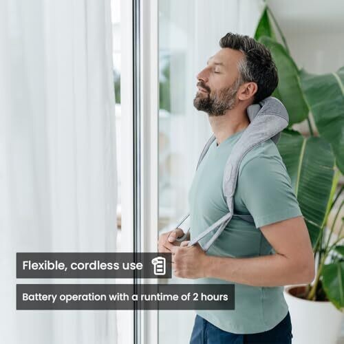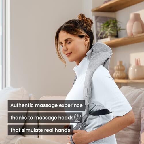 Experience a spa-like neck massage at home with wireless operation for freedom of movement. Six massage heads and fingers mimic professional techniques to relieve neck and shoulder tension, with an optional heat function, two adjustable intensity levels, and a hands-free, secure neck strap.