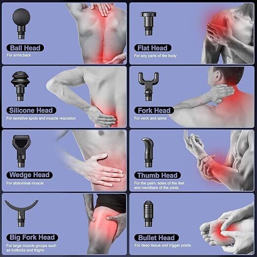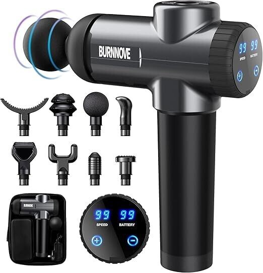 Backski massage gun combines powerful percussion with a compact handheld design. It offers 99 speeds, a 2800 mAh battery, an LED touch display, and eight massage heads for targeted neck and shoulder relief, plus a storage bag.