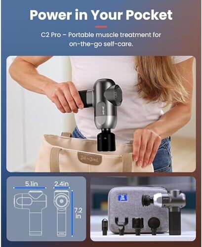 The C2 Pro massage gun offers cold and heat therapy for muscle recovery. Deep muscle therapy is provided with a 10 mm amplitude and up to 44 lbs of percussive force, with five adjustable speeds from 2000 to 3200 RPM. It supports 15W PD fast charging and can be fully charged in 1.5–2 hours using a fast charger. Weight is approximately 1.5 lbs (0.68 kg) and it includes a carrying case for portability. Operation is designed to be whisper-quiet at about 40 decibels and features an LED display that shows speed and force levels. An intelligent chipset provides automatic shut-off after 10 minutes to prevent overuse. The kit includes a hot/cold therapy head and four additional ABS massage heads, along with an ergonomic silicone-wrapped handle to reduce vibrations.