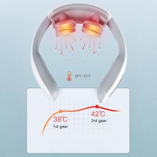 Compact neck massage device delivers heat and electrical stimulation to ease neck pain. It offers 15 levels of deep tissue massage and a portable design for convenient use at home or on the go, using intelligent pulse technology.