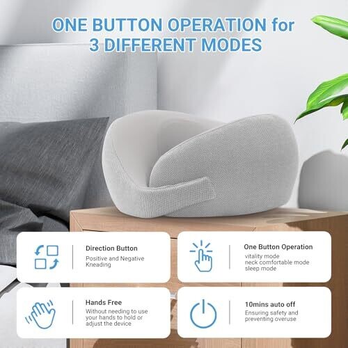 neck massager mimics massage techniques to relax muscles and improve circulation. It offers three adjustable massage modes and one-button control. The device is wireless with 10-minute automatic shut-off for safety. Battery capacity is 2600 mAh. It uses four-node massage heads to deliver deep tissue stimulation. Ergonomic pillow design conforms to neck curvature for support. Materials include fabric and memory foam for comfort and durability. Suitable for use at home, in the office, or while traveling.