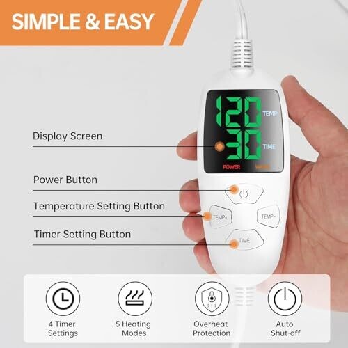 • Personalize comfort with 5 temperature settings and 4 timer options to suit your needs.