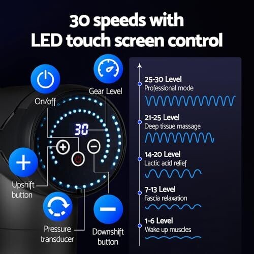 • Customizable comfort with 30 vibration speed levels, letting you dial in the perfect intensity for any muscle group.