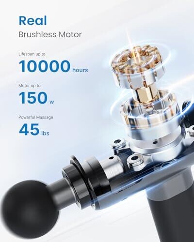 The device features an upgraded brushless motor in a premium metal housing to deliver high-penetration deep-tissue massage. It supports USB-C charging with 5V/2A input (adapter not included) and can be charged by a power bank. The massager weighs approximately 1.5 pounds and operates with a quiet brushless motor, achieving as low as 45 dB. It includes a rechargeable battery and incorporates a 10-minute auto-off protection for safety. The unit offers up to 2800 rpm across 5 speeds and provides 5 different massager heads for targeting various muscle groups.